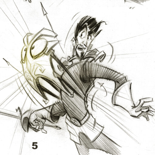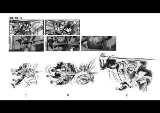 Otra de las cosas que tuve que hacer durante un período de tiempo para «Donkey Xote» fue coger las viñetas del storyboard y mejorar algunas poses y expresiones de cara a que los animadores entendieran mejor el sentido de la acción. Esto también lo realicé conjuntamente con Jacobo Navarro, quién se encargó, entre otras cosas, de diseñar parte de los personajes.